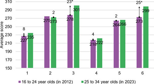Figure 1: Average literacy scores across countries for 16-24 year olds in 2012 compared with 25-34 year olds in 2023